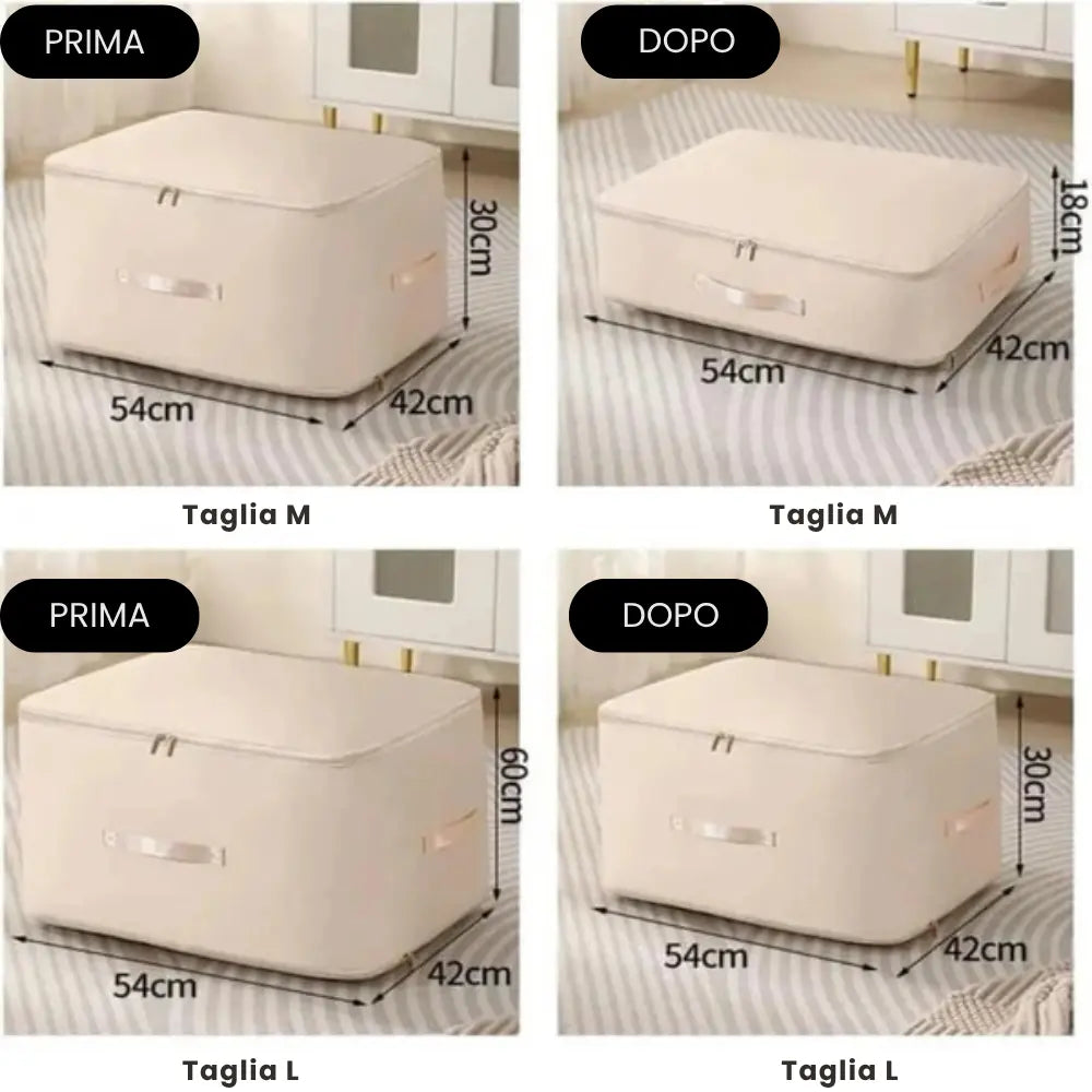 - Taglia L (52x42x60 cm): ideale per piumoni, coperte e abbigliamento voluminoso.