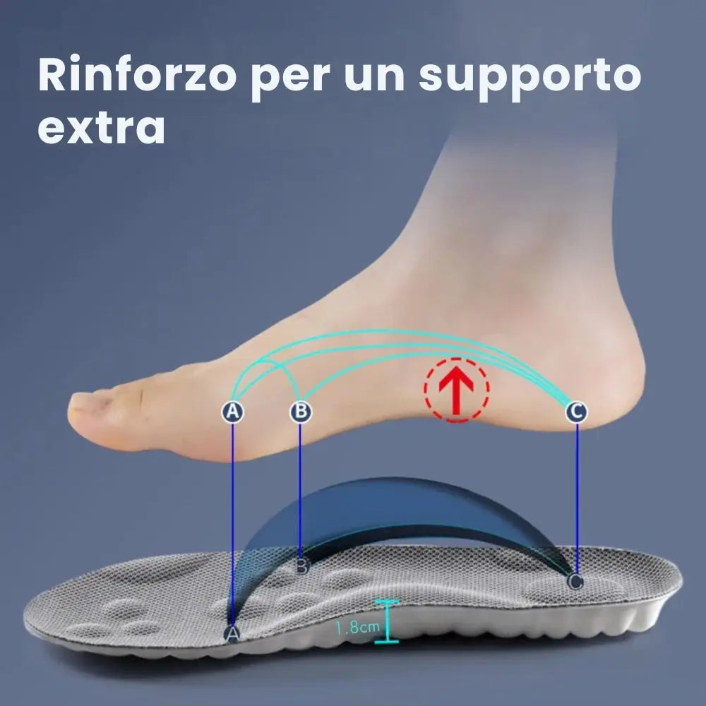 Grazie alla tecnologia 4D a doppio strato, queste solette assorbono ogni impatto e migliorano la postura, riducendo lo stress su piedi, ginocchia e schiena. Perfette per lunghe giornate al lavoro o in viaggio.